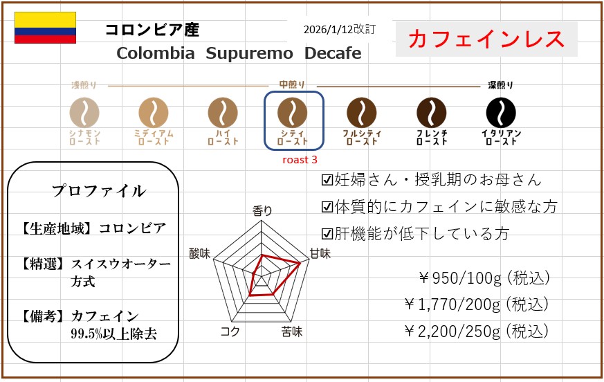 カフェインが苦手なお客様にもコーヒーを楽しんでいただけるよう、カフェインレスの珈琲豆もご用意しております。
